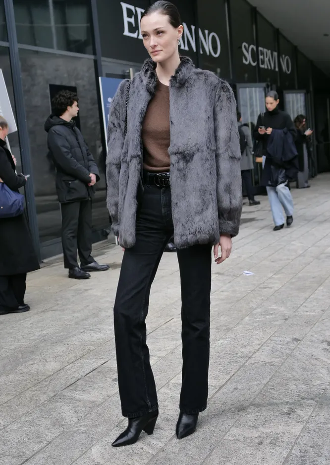 Для начала стоит отметить: шуба может быть любой. И длинной, и укороченной, и объемной. Все решают пропорции. Именно они определяют, какие джинсы подойдут лучше всего. Первый и самый очевидный вариант — выбрать свою любимую пару. Но с поправкой на актуальность. Джеггинсы и чрезмерно обтягивающие варианты давайте оставим в прошлом. Сейчас мода требует немного воздуха в силуэте. И здесь на первый план выходят джинсы-сигареты. Этот крой балансирует между прямым и узким: слегка облегает бедра, но при этом свободно спускается книзу. Еще одна версия, заслуживающая внимания, — джинсы-буткаты. Умеренно расклешенные от колена, они создают мягкий баланс между объемом верха и линией бедра. А если дополнить ансамбль обувью на каблуке, то получатся бесконечно длинные ноги. Не теряют позиций и прямые джинсы — это та самая универсальная опция, которая выручит в любой ситуации. Ключевой момент — посадка. В тренде заниженная талия, создающая легкий намек на ностальгию по Y2K, но если хочется классики, выбирайте среднюю. А высокая талия — беспроигрышный прием для тех, кто хочет лишний раз подчеркнуть длину ног.