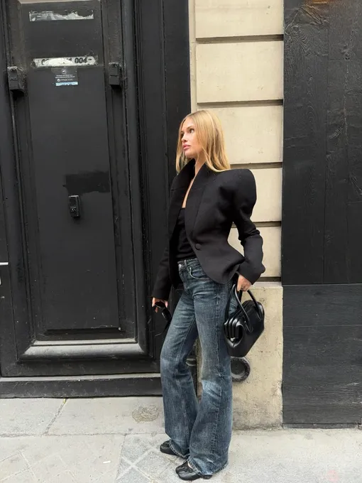 Джинсы-клеш — еще один неожиданный союзник. Несмотря на плоский ход, такие джинсы все равно визуально вытягивают силуэт и красиво подчеркивают длину ног. Балетки здесь работают как сдержанный контраст, не перегружая образ. Важно лишь следить за длиной пары: она должна почти касаться «земли», но не закрывать полностью обувь. Плюс сейчас можно не играть в бохо-шик, а использовать эту опцию и в других стилях.