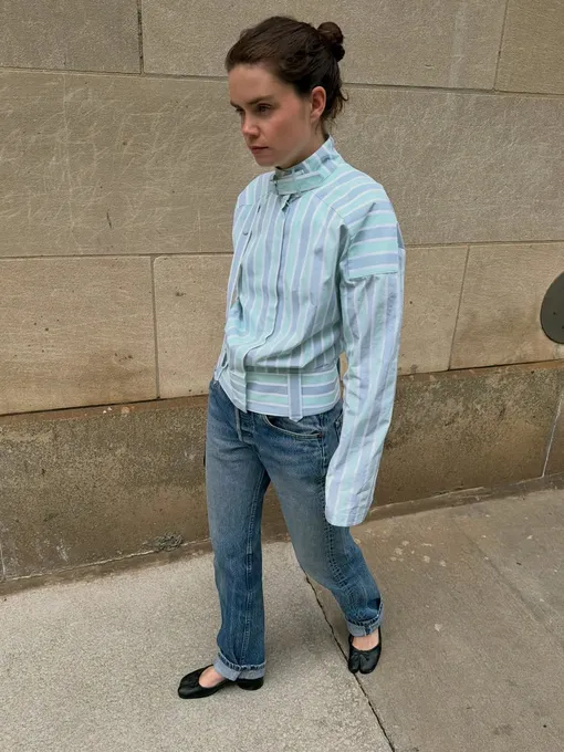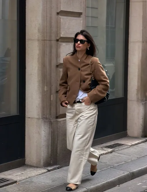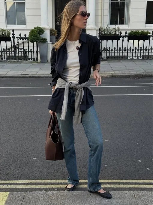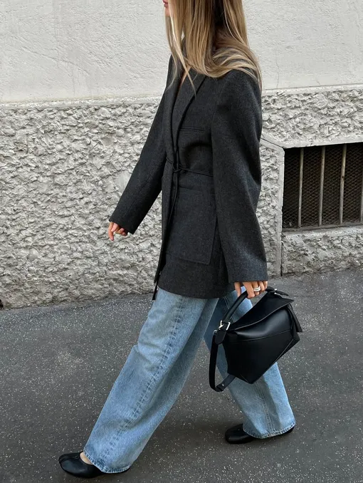 Свободные джинсы завершают наш чек-лист. Без них сейчас не обходится ни одна капсула, так как они действительно пригодятся каждой. Они дают ощущение расслабленности и легко сочетаются с балетками, создавая тот самый повседневный, но продуманный образ. В итоге становится ясно: балетки не требуют сложных решений. Они адаптируются под любой «низ», оставляя нам пространство для игры с настроением и деталями.