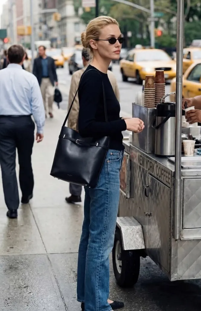 Свободные джинсы завершают наш чек-лист. Без них сейчас не обходится ни одна капсула, так как они действительно пригодятся каждой. Они дают ощущение расслабленности и легко сочетаются с балетками, создавая тот самый повседневный, но продуманный образ. В итоге становится ясно: балетки не требуют сложных решений. Они адаптируются под любой «низ», оставляя нам пространство для игры с настроением и деталями.