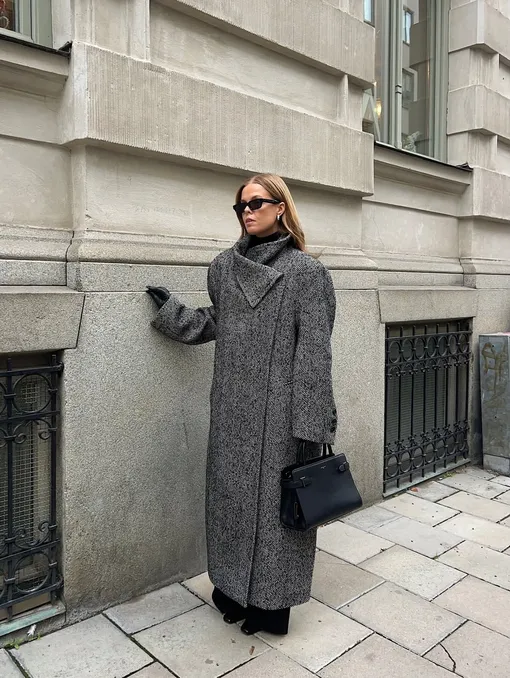 Что делает пальто по-настоящему стильным? В первую очередь — детали. Высокий воротник, четкая линия плеч, капюшон или выразительный принт. Именно нюансы превращают его в полноценное модное высказывание. Среди актуальных узоров сезона — клетка, полоска и, конечно, «елочка». Последняя заслуживает особого внимания. Ткань с узором herringbone узнаваема с первого взгляда: V-образный диагональный рисунок, в котором направления соседних линий зеркально противопоставлены друг другу. «Елочка» выглядит интеллигентно, «дорого» и всегда уместно — именно поэтому она так органично вписывается в наш контекст. Интересно, что это рисунок с историей. Археологические находки в Северной Ирландии и Австрии подтверждают: он существовал еще в VII-VI веках до нашей эры. То есть мы имеем дело не просто с трендом, а с одной из самых устойчивых текстильных традиций, которая пережила столетия и адаптировалась к современной капсуле.