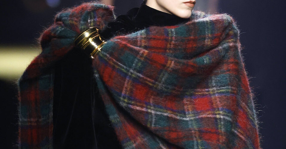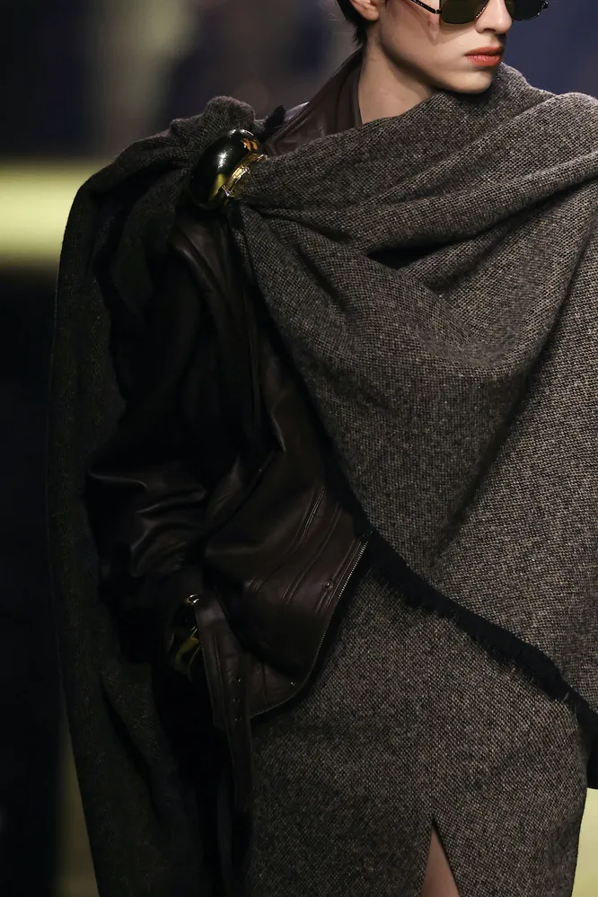 Идеальный пример «дорогого» палантина мы увидели в коллекции Saint Laurent. Объемные, больше напоминающие пледы, накидки с бахромой модели носили поверх свитеров, жакетов и даже кожаных курток. Энтони Ваккарелло выбрал элегантные «дорогие» расцветки: помимо однотонных черных и темно-коричневых палантинов, в коллекции нашлись опции в клетку разных размеров. Впрочем, не только Saint Laurent удалось сделать этот аксессуар «дорогим» — очень минималистичные, но от этого не менее эффектные модели нашлись у Michael Kors и The Row.