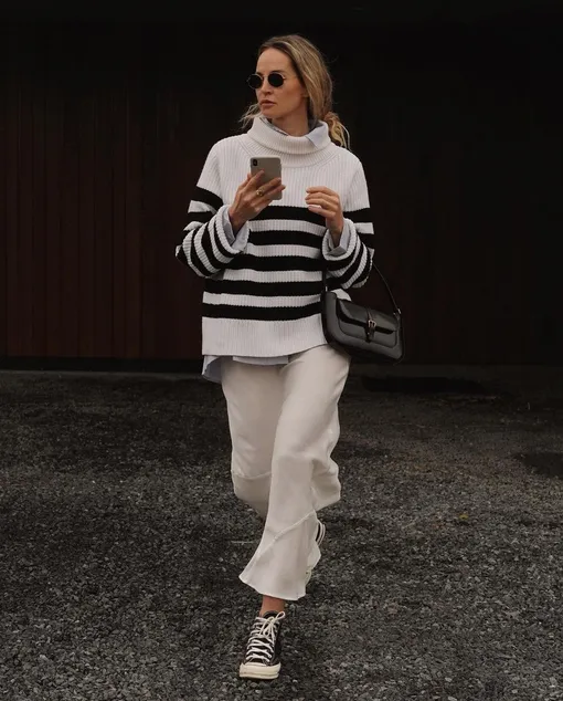 Этот осенне-зимний сезон необходимо встретить хотя бы с одном свитером в полоску в арсенале — он дополнит любой модный образ и спасет всегда, когда вам будет нечего надеть. Полосатые свитеры давно облюбовали модные инфлюенсеры и героини стритстайла. И это неудивительно: свитер с классическим принтом будет смотреться куда интереснее однотонного, но при этом останется достаточно базовым, чтобы сочетать его с абсолютно любыми вещами. Самая классическая модель — так называемый «свитер-тельняшка»: белый в черную полоску или черный в белую.