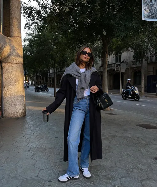 Прямые джинсы — классика на все времена. В целом, с ними можно найти множество удачных сочетаний, и комбо с кроссовками одно из них. Кроссовки могут быть самыми базовыми (как Adidas Gazele) или на массивной подошве, как у супермоделей 90-х — с прямыми джинсами отлично сочетаются любые.