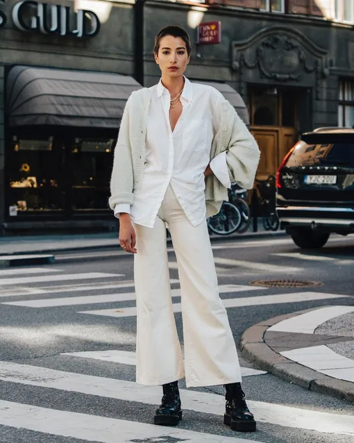 Джинсы клеш не сдают своих позиций вот уже несколько сезонов подряд: сейчас они не менее популярны, чем трендовые модели широкого кроя с низкой посадкой. Хорошей парой к такой модели станут грубые ботинки со шнуровкой и массивной подошвой. Верх при этом может быть любой: от хлопковой сорочки оверсайз-кроя до объемного свитера или спортивной толстовки.