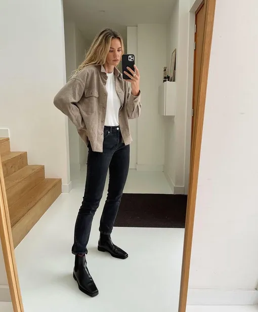 Зауженные джинсы, заправленные в сапоги, очень долго прибывали в списке антитрендов, однако в этом сезоне вновь вернулись на модную арену. В целом, для этой цели подойдет модель и прямого кроя, однако ее будет чуть труднее заправить в обувь. Комбо красиво моделирует ноги, визуально удлиняя их, а сочетать его можно с чем угодно: от водолазок до романтичных блуз.