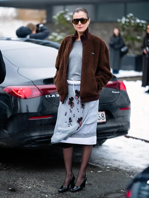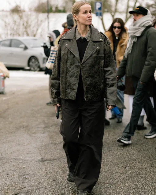 Еще один фаворит — объемная кожаная куртка в духе 90-х. Такой силуэт вызывает чувство ностальгии у тех, кто вырос в постсоветском пространстве. И отсылает к эстетике культовых фильмов о «лихих девяностых». Свободный крой, массивные плечи и плотная кожа формируют выразительный дерзкий лук.