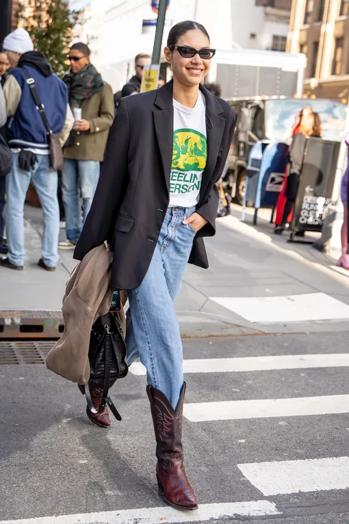 Несмотря на то, что мы наблюдаем снижение интереса к эстетике horse girl, предводительницей которой стала Белла Хадид, модные ковбойские сапоги все еще остаются желанной парой в вишлистах девушек по всему миру. Речь идет казаках, которые в первую очередь можно отличить по скошенному каблуку. Почему именно эта обувь не теряет своей популярности? Ответ один — во-первых, ее легко стилизовать с самым разным «низом» — начиная от скинни-джинсов, которые можно заправить в сапоги, и заканчивая летящими бохо-юбками и макси-платьями с кружевом. А во-вторых, такие пары, несмотря на свою универсальность, не являются классической базой — именно поэтому они могут сыграть роль акцента в повседневном луке и стать финальным штрихом в скучном, на первый взгляд, образе.