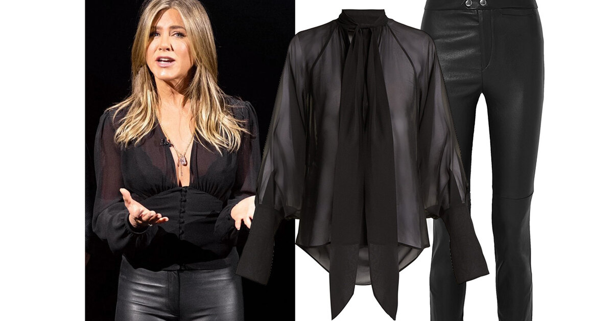 Накануне Дженнифер Энистон выступила на презентации Apple, где был представлен инновационный сервис Apple TV+. На сцену актриса поднялась в сексапильном наряде, черном тотал-луке, состоящем из облегающих кожаных брюк и полупрозрачной шифоновой блузки. Нам так понравился образ 50-летней Энистон, сочетающий в себе женственность и элегантность, что мы собрали альтернативные вещи, чтобы составить похожий аутфит.