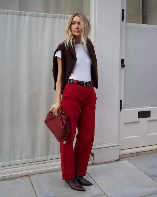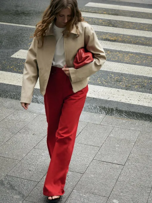 Что касается кроя, марки предлагают нам выбор: прямые, зауженные, широкие, укороченные, джинсы-клеш, буткаты, баллоны или даже со стрелками. Ориентируйтесь на свой тип фигуры и личные предпочтения. Отдельного внимания заслуживает заниженная посадка — именно она чаще всего появляется на актуальных шоу, и задает образу расслабленный ритм. Как их носить? Стилизовать такие джинсы проще, чем кажется. Достаточно добавить к ним базовый «верх» и позволить цвету сыграть главную роль. Так, он красиво сочетается с коричневым, черным, бежевым или белым. Или можно пойти дальше и поддержать его в деталях. Например, дополнить красной сумкой или обувью. А самые смелые из вас могут примерить такие джинсы с тренчен тон в тон. В любом случае красные джинсы работают как самостоятельный акцент, который собирает образ без лишних усилий.