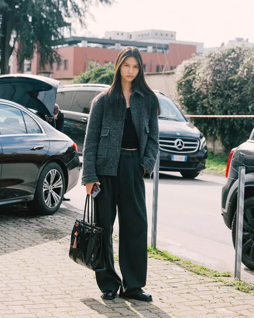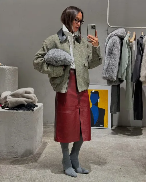 Цвет? Черный, серый, шоколадный, темно-синий или хаки — впишутся в любую капсулу. Если хочется яркости, обратите внимание на насыщенные цвета: красный или фиолетовый. С чем его носить? Про привычные комбинации вы знаете и без нас, но не бойтесь интегрировать его и в женственные аутфиты. Например, с юбкой-карандаш из кожи или классическими брюками. Также вместо привычных джинсов всегда можно сделать ставку на вельвет. Получится классная игра разных фактур. Такой бомбер легко заменит пуховик в начале весны. Он теплый, выразительный и удивительно гибкий в стилизации — именно те качества, которые особенно ценятся в межсезонье.