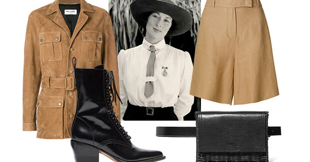 Каждое появление Мерил в кадре — это очередная порция хлопковых и льняных сорочек, брюк карго, платьев-рубашек и приталенных жакетов в палитре из хаки, охры и песка, а также соломенных и фетровых шляп, обуви и аксессуаров из черной и коричневой кожи.