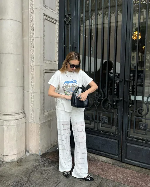 Главное правило, которым стоит руководствоваться при выборе обуви к брюкам в технике кроше — никаких каблуков. Расслабленный фасон будет резко контрастировать с лодочками, что не позволит комплекту выглядеть гармонично. Даже к босоножкам на небольшом каблуке kitten-heel стоит относиться аккуратно: они легко могут испортить образ своим официальным видом. А вот парам на плоской подошве говорим «да». Особенно простым базовым вьетнамкам, мюлям без каблука, кроссовкам в ретро-стиле и трендовым балеткам — такие модели идеально впишутся в отпускной лук и «разделят» его расслабленное настроение. Ниже собрали 5 простых, но стильных брюк-кроше на лето-2025, которые легко станут основой повседневного летнего образа и благодаря своей универсальности будут актуальны даже в следующем сезоне.