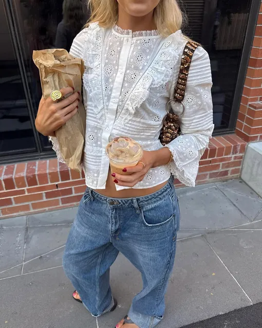 Обычно такая техника присуща рубашкам и блузкам в трендовом крестьянском стиле. Выходит, покупая модель с вышивкой ришелье можно попасть сразу в две актуальные тенденции — деревенскую коттеджкор эстетику и кружево ручной работы, которое сейчас все чаще и чаще используют бренды. Так поступают и самые главные it-girls фэшн-индустрии: например, модель Кайя Гербер стилизует укороченную ажурную рубашку с простыми прямыми брюками в темно-синем цвете, черными балетками и вместительный холщовым тоутом, а актриса Дейзи Эдгар-Джонс носит ее удлиненную вариацию отдельно от любого «низа» как платье, дополняя лишь белыми босоножками на высоком каблуке и плетеной мини-сумкой.
