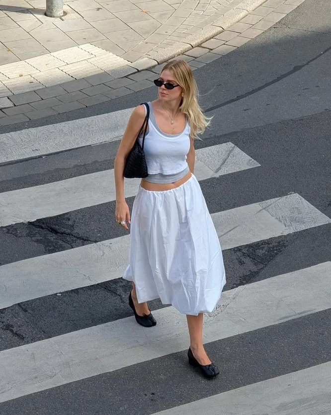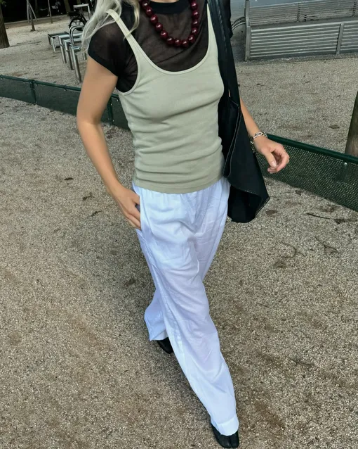 Многослойность — один из самых выразительных приемов. Это не просто про «надеть одно на другое», это про создание объема, игры фактур и создание цветовых нюансов в образе. Особенно эффектно он смотрится в минималистичном ключе: когда каждый слой продуман до мелочей и выполняет не только эстетическую, но и функциональную задачу. Да, летом задача усложняется — требуется внимательность к тканям и силуэтам. Но именно это превращает аутфит в нечто по-настоящему запоминающееся. Простейшая и, пожалуй, универсальная комбинация — «майка + рубашка». Лучше всего — из тонкого хлопка, муслина или льна. Майка может быть базовой белой или с акцентом, рубашка — с коротким рукавом или оверсайз. Добавьте сюда шорты-бермуды или льняные брюки, вьетнамки и соломенную сумку — и вот у вас готов городской лук. Более интересный вариант — надеть футболку под платье. Особенно удачно здесь работают опции на тонких бретелях. Этот трюк хорош тем, что снимает вопрос дресс-кода. Плюс футболку всегда можно заменить на тонкий лонгслив — если вечер обещает быть прохладным.