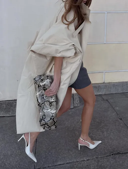 Следующая пара на очереди — белая. Почему именно белый? Во-первых, это оттенок года по версии Pantone — и на этом можно закончить аргументацию, она уже звучит убедительно. Но если вам нужны еще доводы, то, во-вторых, белый — это чистый ахроматик без выраженного холодного или теплого подтона. И это идеальный холст для любых стилистических экспериментов. Именно эта нейтральность классно работает с фактурами: гладкой кожей, матовыми или лакированными текстурами. Белые туфли легко меняют характер образа. Они добавляют свежести базовым сочетаниям и делают вечерние комплекты более выразительными. Даже привычная комбинация джинсов и жакета выглядит продуманнее, когда в ней появляется светлая пара.