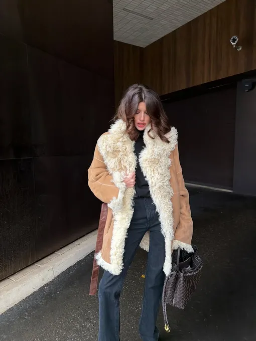 Дубленка — настоящий маст-хэв зимы 2026. Она объединяет в себе комфорт и трендовость, а благодаря адаптивному характеру легко вписывается в разные жизненные сценарии. Чаще всего зимой мы тянемся к темным насыщенным оттенкам, но светлую палитру не стоит списывать со счетов. Почему? Наряду с яркими цветами и выразительными принтами в этом сезоне набирают силу спокойные естественные тона. И бежевый — главный его представитель. Цвет, который ассоциируется с теплом, мягкостью и благородством. От слоновой кости и до глубокого «кофе с молоком» и теплого кэмел — бежевая гамма разнообразна. При этом такая дубленка не требует сложных стилистических решений. Фасоны? Здесь все зависит от вашего ритма жизни. Дубленка-авиатор идеальна для динамичных будней. Модель с поясом красиво подчеркивает талию и придает силуэту женственность. Длинные модели в пол подойдут для луков в духе après-ski, а версии до середины бедра слегка свободного кроя вы сможете носить и в городе, и на природе. Отдельное внимание стоит уделить материалу. Классическая дубленка выполняется из натуральной овчины особой выделки: кожа снаружи, мех внутри. Эко-версии легче, демократичнее по цене и проще в уходе, но по теплоизоляции и сроку службы уступают натуральным.