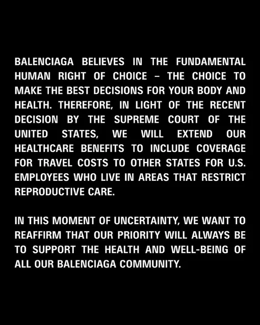 В мире происходит много странного, но мысль о том, что в XXI веке мы всерьез будем обсуждать запрет на аборты в стране с крупнейшей мировой экономикой, до недавнего времени казалось совсем уж абсурдной. Тем не менее, этот момент наступил. На прошлой неделе Верховный суд США отменил решение по делу «Роу против Уэйда» 1973 года, признавшее право на аборт конституционным. С этого момента каждый штат может самостоятельно запрещать аборты на своей территории — причем даже для жертв изнасилования. Этим правом сразу же воспользовались 7 штатов, еще в 13 это произойдет «в самое ближайшее время». Модные бренды, от которых в последние годы уже по умолчанию ждут какого-то ответа на ключевые темы социальной повестки, начали реагировать незамедлительно. Как показал опыт протестов #BlackLivesMatter и ситуации в Украине, запоздалая реакция иногда хуже молчания — поэтому выступить с заявлением и принять какие-то меры нужно было в первые же дни. А репутация уже давно превратилась в самый дорогой ресурс, который только может быть у бренда — и удар по ней не компенсируешь никакой удачной коллекцией и никакими аксессуарами-бестселлерами.
