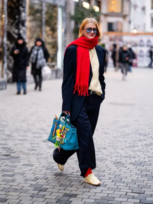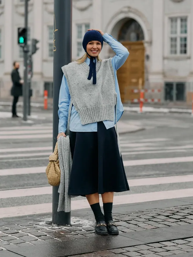 Выбор пары начинается с материала. Для ранней весны лучше всего подойдет кашемир или шерсть. Они сохраняют тепло и добавляют фактурности, особенно варианты в рубчик или сложной вязки. Чем интереснее текстура, тем сильнее визуальный эффект. Не менее важна палитра. Универсальные оттенки — черный, серый, хаки, коричневый, молочный и бежевый — легко вписываются в гардероб. Но сейчас активно звучат насыщенные цвета: глубокий синий, бордовый, фиолетовый, красный, оранжевый или шартрез. Они работают как акцент и оживляют даже деловые ансамбли. Стилизовать носки проще, чем кажется на первый вгляд. Главное правило — не скрывать их. Позвольте аксессуару стать заметной частью наряда. Сочетайте плотные шерстяные модели с лоферами и укороченными брюками (или подверните джинсы), добавляйте их к туфлям с юбками в длине миди или комбинируйте с босоножками для контрастного эффекта. Иногда именно маленькая деталь способна задать тон всей капсуле.