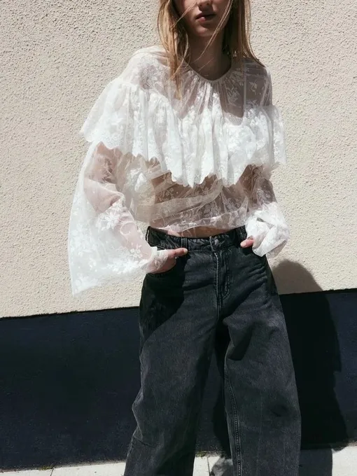 Весной всегда возникает желание выглядеть красиво и романтично. Это настроение складывается из множества деталей: световой день увеличивается, воздух становится теплее, и вместе с этим появляется внутренний импульс к обновлению. После зимы особенно остро ощущается потребность сменить плотные фактуры на более легкие. И вместе с этим — придать себе чуть больше уверенности. В такие моменты рука сама тянется к вещам с характером. Один из самых точных выборов — блуза. Воздушная, с рюшами, кружевом или аккуратными оборками. Та самая, в пасторальном настроении, где есть чувственность, но без лишней театральности. И важная деталь: носить ее стоит не в привычной романтичной связке с юбкой, а с джинсами.