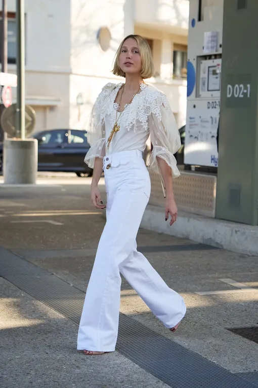 Каждый теплый сезон пасторальный стиль возвращается: раньше его чаще ассоциировали с загородом и отпуском, но сегодня он уверенно чувствует себя в городе. Само течение восходит к искусству: этот жанр воспевает спокойную жизнь за пределами города, красоту природы и ощущение тишины. В моде он закрепился в 1970-е, став альтернативой бохо-шику, и строится он на сочетании «исторических» силуэтов (от викторианской эстетики до ампира и французского Прованса) с более расслабленным настроением. Сегодня к нему снова обращаются дизайнеры. Особенно ясно это видно в коллекциях Chloé под руководством Чемены Камали: рюши и кружево становятся ключевыми элементами всех ее шоу. Самый простой способ вписать этот тренд в повседневную капсулу — начать с блузы. Четких рамок здесь нет: ориентируйтесь на детали, которые задают настроение. Рюши, кружево, легкая воздушность — все, что добавит образу мягкости и движения. Дополнением могут стать аккуратные бантики или выразительный воротник. Джинсы в этой формуле играют роль баланса. Они убирают излишнюю декоративность и делают образ более повседневным. Фасон вы выбираете по своему настроению: прямые и слегка зауженные смотрятся сдержанно, свободные добавляют расслабленности. Отдельное внимание уделите джинсам-клеш: они поддерживают ретро настроение лука.