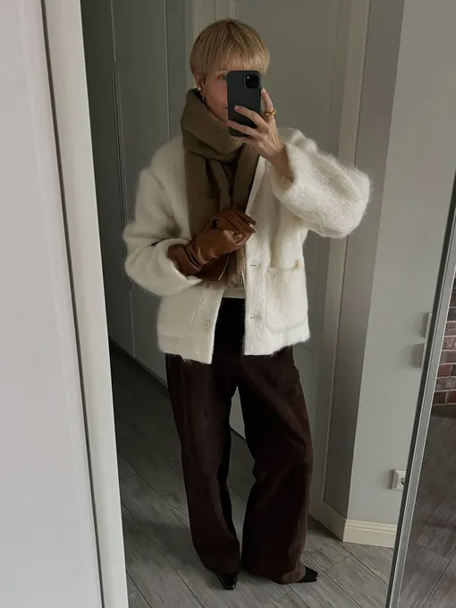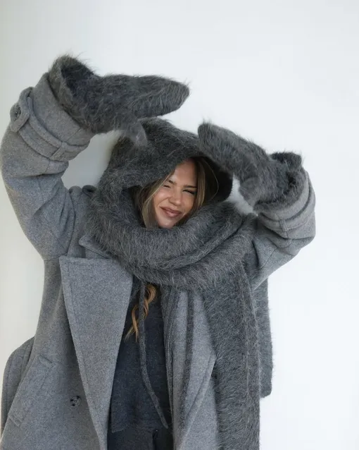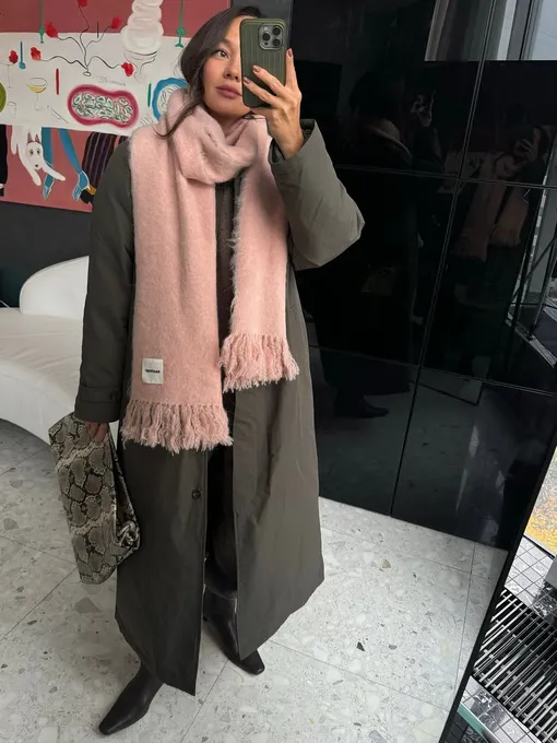 Шарф — один из самых недооцененных айтемов. Мы привыкли воспринимать его как «необходимость» и забываем, что он способен полностью изменить ансамбль. Добавить мягкости строгому пальто. Структурировать объемный пуховик. Сделать монохромный аутфит выразительным. Почему именно мохер? Это материал с историей. Он производится из шерсти ангорских коз, и отличается особой фактурой: воздушной и пушистой. Чистый мохер слишком легкий и деликатный, поэтому для пряжи используют смешанный состав: его дополняют овечьей шерстью или акрилом. Мохеровые шарфы существуют в двух направлениях. Базовые — в натуральных оттенках (молочный, лунный серый, карамельный, графит). И акцентные — яркие, насыщенные, в полоску или клетку (зеленый, красный, оранжевый, кобальтовый). Последние вариации идеально подходят тем, кто любит колор-блок и хочет добавить в образ энергии. А если вы предпочитаете шарфы спокойных цветов, которые подойдут абсолютно ко всему, поздравляем. Вы в этом не одиноки. И ни один из вариантов не выглядит модной прихотью: это приобретение, которое работает годами.