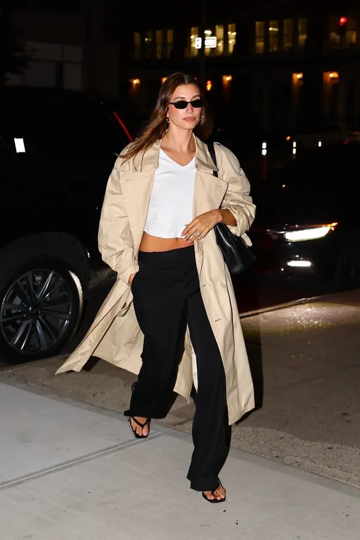 Как же составить такой стильный контрастный комплект? Во-первых, необходимо взять базовую белую футболку, которая сыграет роль основы образа. Она может быть выполнена из любого материала — шелка, хлопка, льна, трикотажа или лиоцелла. Второй шаг — подобрать удобные черные базовые брюки. Рекомендуем сделать выбор в пользу прямых палаццо или зауженных «дудочек», которые идеально впишутся в этот повседневный лук. Если вдруг хочется удвоить трендовость такого аутфита, советуем также присмотреться к шароварам — они должны быть черными и не очень пышными, чтобы не разрушать визуальный ряд комплекта. Следующий на очереди тренч. Конечно, модель в песочном оттенке сыграет роль самой незаменимой верхней одежды, однако это не значит, что ей нет альтернатив. В этом сезоне особенно популярны вариации в белом, хаки и светло-сером оттенке. В роли обуви выступают те самые вьетнамки на микро-каблуке, которые напоминают о том, что плохая погода не вечна, а отпуск совсем близко. Среди аксессуаров — солнцезащитные очки в овальной оправе, минималистичные серьги-кольца и также черный объемный тоут, в который можно вместить все необходимое. Ниже мы собрали главные элементы, которые помогут собрать идеальный лук на прохладный июнь, как у Хейли Бибер.