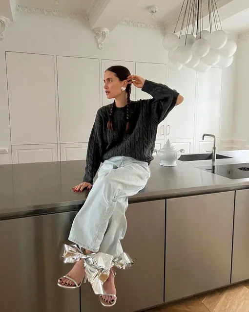 Эта мысль нас посетила, когда мы увидели кадры с новой коллекцией Loewe Pre-Fall 2023 в соцсетях Джонатана Андерсона. На одном из фото модель позировала в туфлях из сияющей новогодней мишуры и совершенно обычных черных брюках. Вдохновившись этим снимком, мы решили, что в предпраздничные и праздничные дни так и будем одеваться — комфортно, но вот с такими яркими деталями. Так что доставайте с дальней полки свои любимые туфли Золушки, сияющие всеми стразами мира, и надевайте их с простыми рваными джинсами и серым джемпером: так никто не упрекнет вас ни в недостаточной нарядности, ни в том, что вы одеты немного too much. И вперед — праздновать!