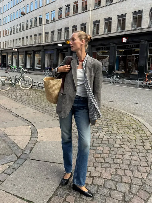 Существует стереотип: лето и прием многослойности несовместимы. Но на деле это не совсем там: этот трюк можно и нужно использовать. Начните с базовой майки и зауженной пары джинсов, накиньте сверху рубашку, а затем жакет. Такой аутфит работает на контрасте: расслабленная основа и собранный «верх». Добавьте соломенную сумку — она сбалансирует серьезность жакета и напомнит: за окном все-таки август. Финальный штрих — трендовые крупные бусы.