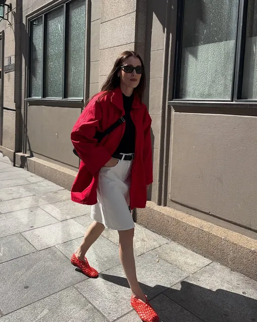 Кожаный жакет — это то, что обычно достается из шкафа ближе к сентябрю. Но в этом году все иначе. В тандеме с белыми джинсами и простой майкой она выглядит неожиданно свежо. Добавьте балетки, мокасины или даже кроссовки — обувь можно менять в зависимости от погоды и настроения. А если хочется акцента, то используйте шелковый платок, повязав его на сумку или пояс.