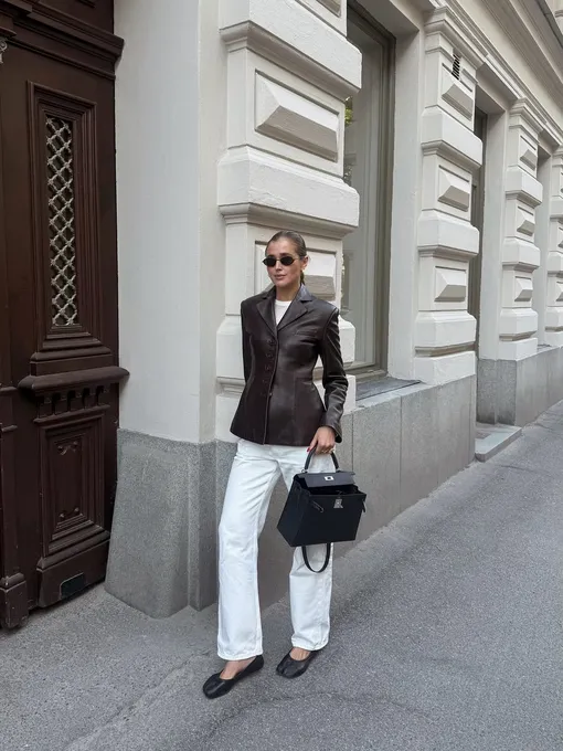 Кожаный жакет + белые джинсы