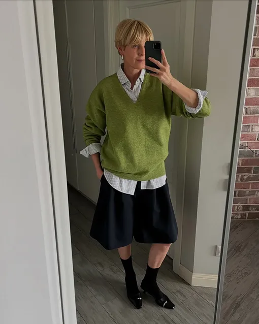 Чуть более сложный, но невероятно модный лук — для тех, кто не боится стилистических экспериментов. Костюмные бермуды в комплекте с классической рубашкой создают элегантную базу. Сверху — тонкий джемпер с V-образным вырезом, который можно повязать на плечи или накинуть, если похолодает. Главная деталь — обувь. Туфли-слингбэки на плоском ходу или на kitten heel в паре с носками — ультрамодный комфортный ход.