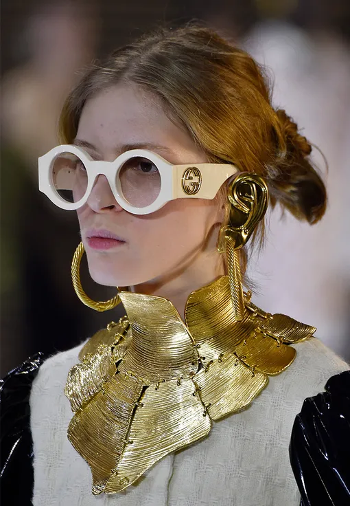 Необычных аксессуаров на показе осенне-зимней коллекции Gucci было, конечно, много. Колье с шипами, маски и шлемы, имитирующие чудных, неизвестного происхождения, божеств. Но больше всего нам с первого взгляда понравились не все они, а скромные (насколько это вообще возможно в таком контексте) золотые уши.