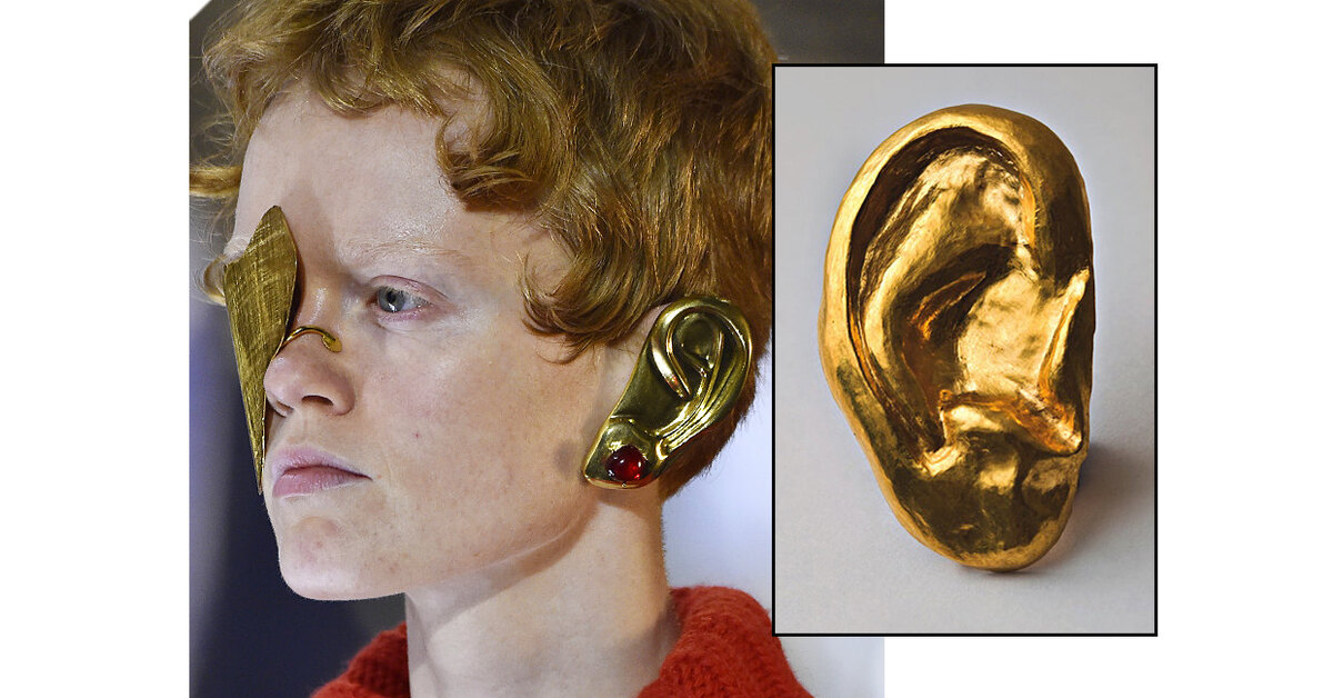 В одном из образов броские уши шли в паре с позолоченными слезинками, укрепленными на щеках модели и напомнившими нам работы Дельфины Делеттре. Но оказалось, что она к показу отношения не имеет. А вот сами каффы в виде ушей вдохновлены работами художника Эдуардо Косты Fashion Fiction #1 1966 года. Прославились его «уши» в свое время благодаря съемке Ричарда Аведона для Vogue в 1968-м.