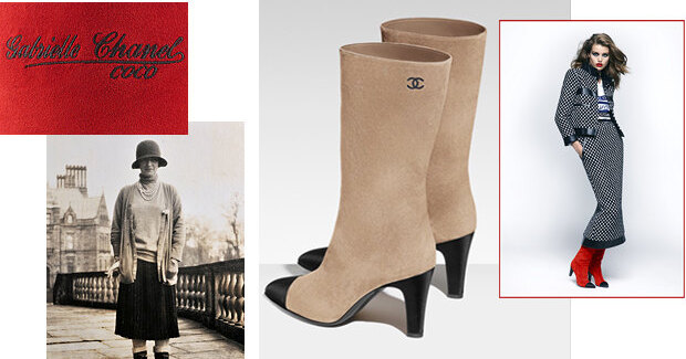 Классические двухцветные сапоги Chanel two tone boots впервые увидели свет в 1958 году, когда страстная поклонница конного спорта Коко Шанель обзавелась парой идеальных сапог для занятий верховой ездой. Однако нам не пришлось бы говорить о них, не сочини великая мадемуазель годом раньше двухцветные two tone shoes - туфли без задника на 5-сантиметровом квадратном каблуке.