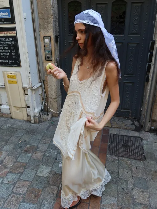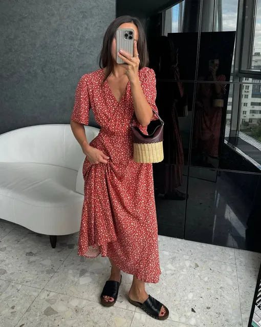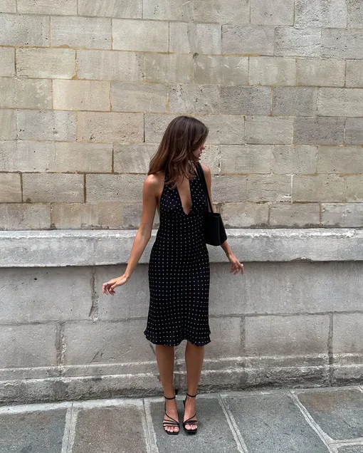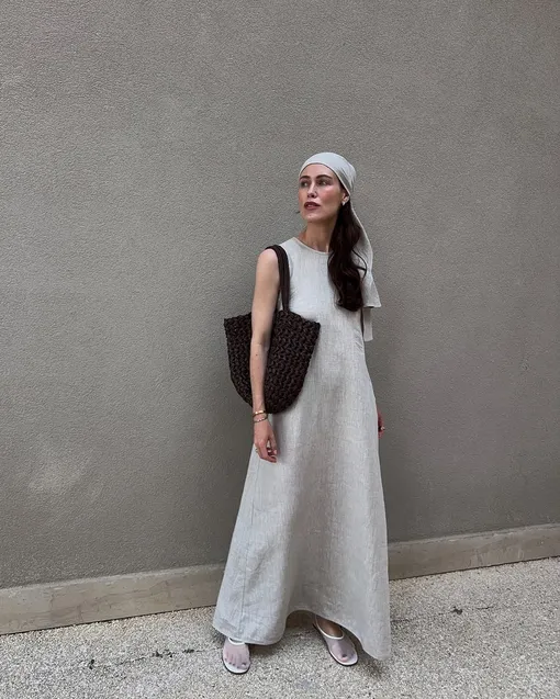 Как освежить лаконичное платье-майку? Ответ — в аксессуарах. Повяжите на голову платок как бандану, возьмите кожаную плетеную сумку и наденьте балетки из сетки. Каждая деталь по отдельности — модный элемент, а вместе они создают гармоничный и актуальный ансамбль.