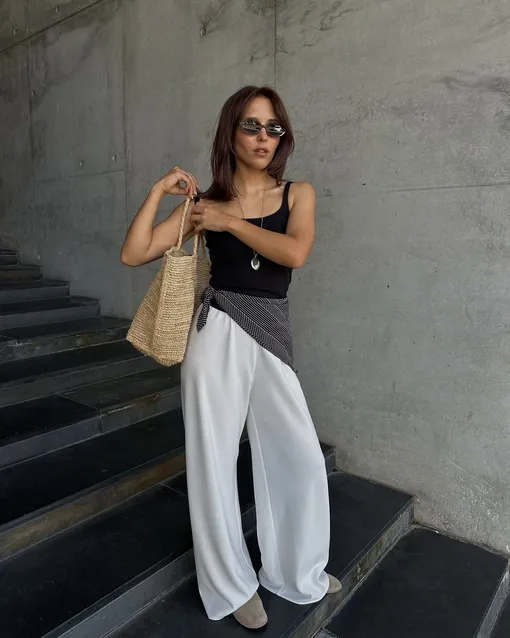 Майка и брюки — что может быть проще? А вот если составить такой ансамбль, играя на контрастах, то получится трендовый лук. Так, берите шелковые брюки, хлопковый топ, а в качестве сумки — соломенную версию. И завершите аутфит балетками из замши.