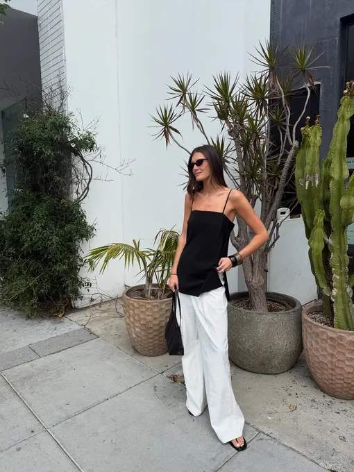 Комбинация черного топа и белых льняных брюк — визуальное воплощение лета в городе. Чтобы аутфит не выглядел слишком просто, добавьте аксессуары — например, пластиковые браслеты. И лучше сразу несколько.