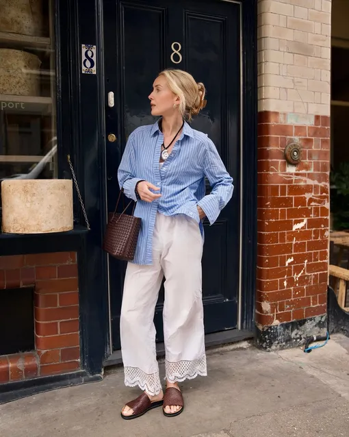 Пижамный тренд давно перешагнул за границы спален — расслабленные костюмы, шелковые брюки и сорочки уверенно завоевали городские гардеробы. Еще одна идея: скомбинировать «верх» и «низ» из разных комплектов. Например, рубашка в полоску миксуйте с белыми брюками. Украшение в морском стиле — например, ожерелье с ракушками или подвеской в форме сардины — станет финальным штрихом лука.