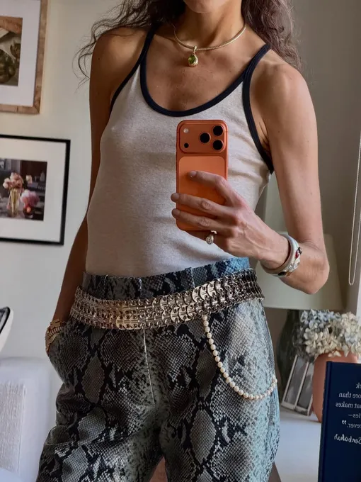 Если вы готовы к более выразительным решениям, попробуйте сочетать акцентные ремни с уже «активной» одеждой. Кожаные брюки со змеиным рисунком Леандра дополняет металлическим ремнем и добавляет жемчужную подвеску (на «основной» ремень). В результате получается сложная композиция, где каждый элемент усиливает другой.