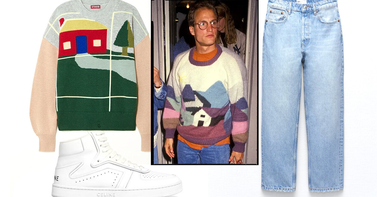 Например, как у Вуди Харрельсона — с фантазийным пейзажем с домом. Снимок, на котором актер запечатлен вместе с Гленн Клоуз, был сделан в далеком 1991 году, а образ кинозвезды актуален как никогда. Комплект, над которым Харрельсон, кажется, не особо старался, составлен по всем канонам 90-х — джинсы-бананы заправлены в высокие кроссовки (именно такие стали хитом последней коллекции Celine), из-под свитера торчит контрастная футболка, очки с круглой оправой и сумка-мешок. Лучше всего искать оригинальный трикотаж в винтажных магазинах, но и в ассортименте онлайн-магазинов мы нашли удивительно похожий на оригинал экземпляр.