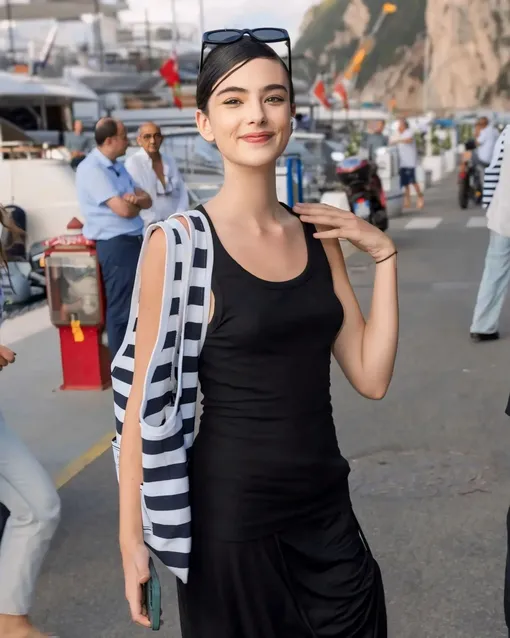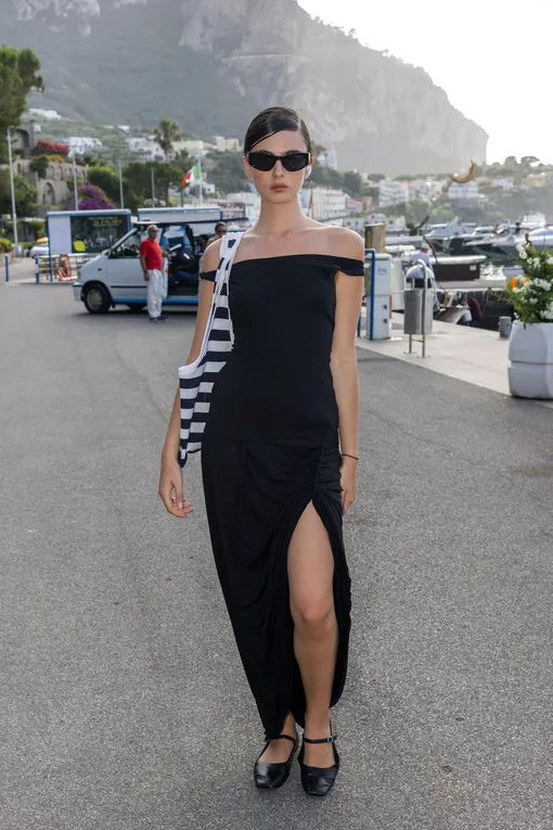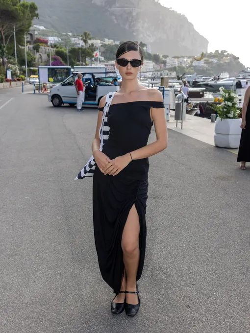Пожалуй, тотал-блэк — самое популярное цветовое решение, к которому модницы обращаются при составлении своих образов. Исключительно траурной черная одежда считаться давно перестала и сейчас скорее служит синонимом стиля и элегантности. Черная одежда выглядит «дорого», не вызывает ни малейших сложностей со стайлингом, идет всем и к тому же отлично корректирует фигуру визуально. Впрочем, даже при всех этих преимуществах в теплое время года мы часто отдаем предпочтение более светлой одежде, а все и-за способности черного цвета притягивать тепло. Впрочем, одеваться в тотал-блэк можно и летом: главное — правильно составить образ. Использовать одежду из тонких дышащих тканей и правильно ее стилизовать. Думаете, это сложно? Дева Кассель бы с этим не согласилась. На прошлой неделе фотографы «поймали» ее после юбилейного показа Jacquemus на острове Капри: бренду исполнилось 15 лет и Дева приняла участие в шоу в качестве модели. После окончания показа звезда появилась в стильном тотал-блэк образе, который идеально подойдет на все случаи лета. Тем более, что повторить его предельно просто.
