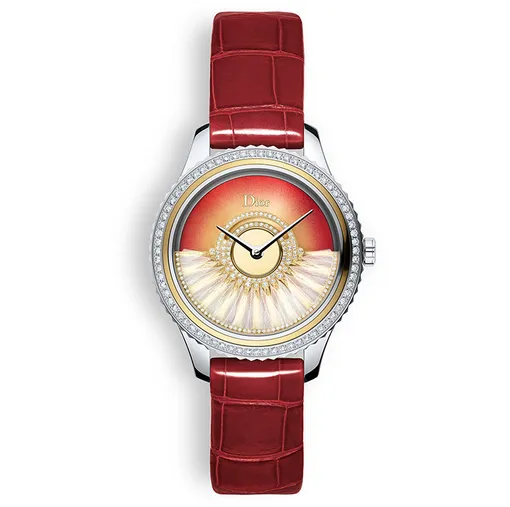 Новая версия привлекает внимание контрастом стального корпуса и ремешка из драгоценной кожи аллигатора красного цвета. Украшенный белыми перьями ротор приводится в движение автоматическим механизмом Dior Inversé 11 ½ и напоминает кружащееся в танце бальное платье, а бриллианты на безеле и циферблате добавляют Dior VIII GrandBal загадочного сияния.