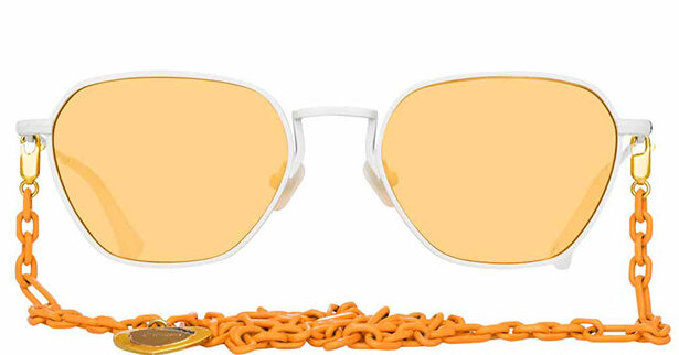 Самый простой способ посмотреть на мир по-новому – надеть солнцезащитные очки с цветными линзами. Найти такие можно в коллаборации двух небезызвестных брендов Linda Farrow x Alessandra Rich. Звезда коллекции - оправа трапециевидной формы, к которой прилагается съемная цепочка для носки на шее — самостоятельный аксессуар, который отлично впишется в яркие летние образы. На выбор пять цветов линз: салатовый, оранжевый, голубой, темно-зеленый и черный. Оттенок оправы тоже можно подобрать по вкусу.