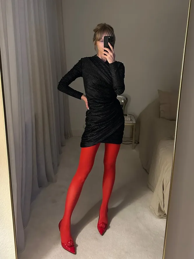 Не ограничивайтесь только цветом. В сезоне заметны кружевные варианты, опции с деликатным декором, узорами и фактурой. Такие колготки легко становятся главным украшением наряда, особенно если остальная часть образа выдержана в спокойных тонах. Как носить яркие колготки? Самый очевидный вариант — с платьями и юбками, где они сразу попадают в фокус. Но не менее интересно смотрятся и комбинации с брюками, если вы выбираете укороченные модели или намеренно открываете щиколотку. Для вечерних комбо выбирайте неожиданные сочетания. Яркие колготки отлично работают не только с туфлями, но и с босоножками или мюлями. И не забывайте про трюк колор-блок. Поверьте, даже самый лаконичный лук приобретет с ними новое звучание.