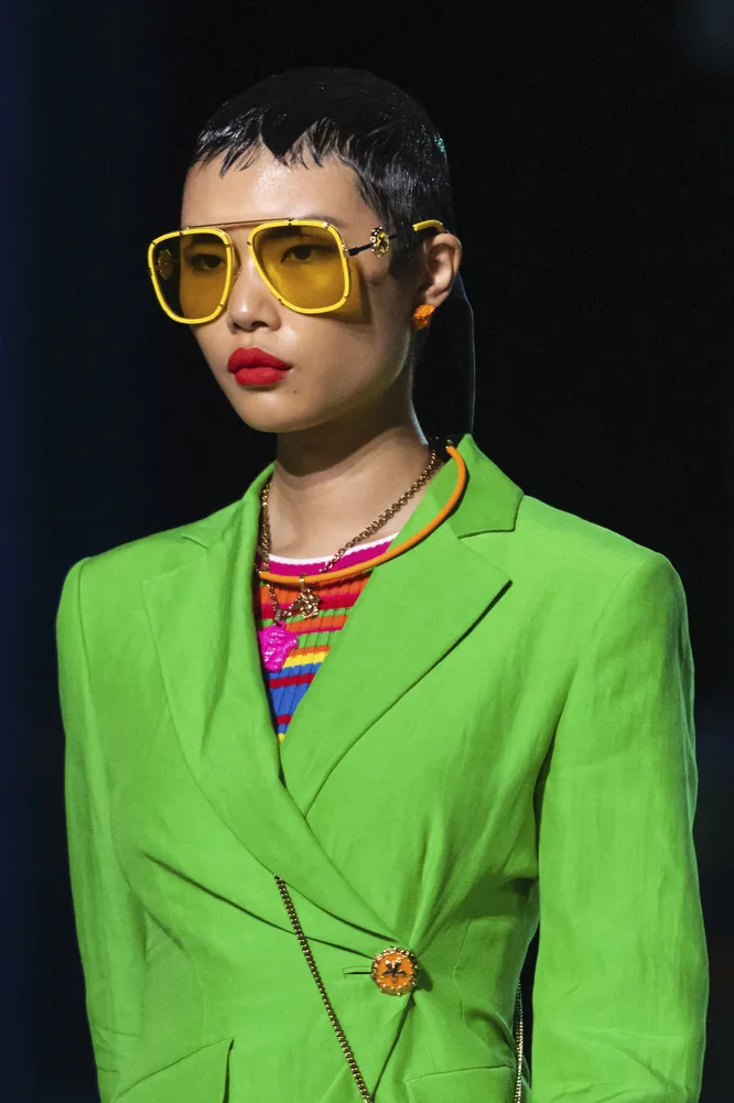 Самой яркой новинкой сезона стали солнцезащитные очки Thom Browne — в новом лукбуке бренда все модели стоят в одинаковых очках-авиаторах. Все они выполнены в золотой оправе и имеют зеркальные золотые линзы. Их внешний вид ассоциируется с эстетикой девяностых, винтажными моделями очков и старыми фотографиями с модных показов. За это их уже полюбили модницы — и, уверены, мы еще не раз увидим эти очки.