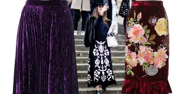 Погода за окном вносит временные коррективы в наши образы и пока не позволяет выбираться на долгие прогулки в вещах из тонких струящихся тканей. А вот бархат — другое дело, в юбках из бархата даже легкий мороз не страшен, а выглядят они при этом празднично и необычно, неизбежно привлекая внимание к своей владелице.