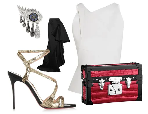 Брошь, Ileana Makri; юбка, Lanvin; босоножки, Christian Louboutin; топ, Roland Mouret; клатч, Louis Vuitton