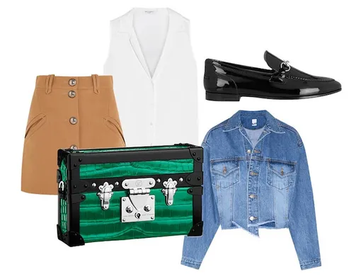Юбка, Chloé; блузка, Equipment; лоферы, Gucci; жакет из денима, Steve J & Yoni P; клатч, Louis Vuitton