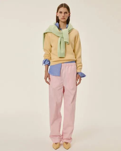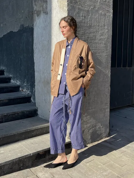 «Пижама» давно вышла за пределы спальни. Еще в начале XX века такие ансамбли стали частью курортного гардероба, а теперь уверенно чувствуют себя в городе. Легкость, расслабленность и ощущение свободы — именно за это их выбирают. Пижамные силуэты легко подстраиваются под повседневные и вечерние образы, и не теряют актуальности уже несколько лет. И в первую очередь вам нужны именно брюки. Если говорить о крое, то лучше всего работают прямые или слегка свободные модели. Посадка средняя или заниженная, на завязках или мягкой резинке. Это тот случай, когда стиль не требует жертв и компромиссов. Многое зависит от материала. Летом особенно хорошо работают лен, хлопок, шелк и его смесовые варианты с вискозой. Они держат форму, позволяют коже «дышать» и красиво повторяют изгибы тела при движении. Принты можно выбрать под настроение: тонкая полоска или клетка добавят легкой «домашней» интонации. Но можно выбрать и однотонные вариации. Нейтральная или пастельная гамма сделают лук более спокойным и универсальным. Только присмотритесь не только к черным или коричневым парам, но и к нежно-розовым или сливочно-желтым.